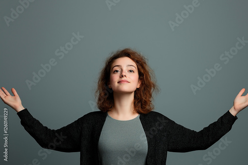 a serious girl with an expression of ecstasy dressed in a black sweater and her arms open in a sign of prayer, hope and joy