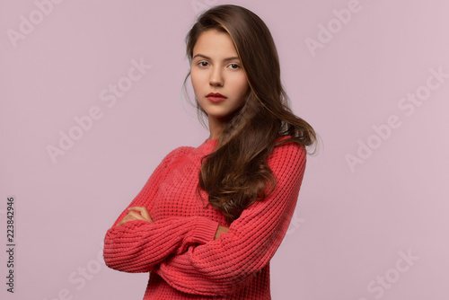 A serious young woman in a red knitted sweater with long dark hair folds her hands on her chest. Brooding expression of and attentive glance