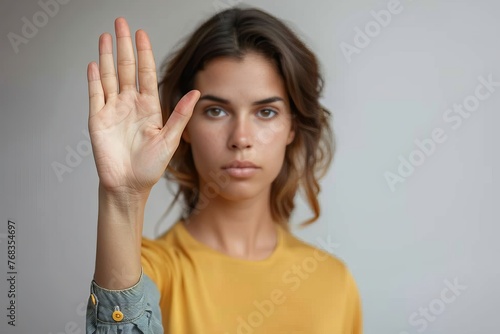 A serious-looking woman with brown hair in a yellow top extends her hand in a stop gesture