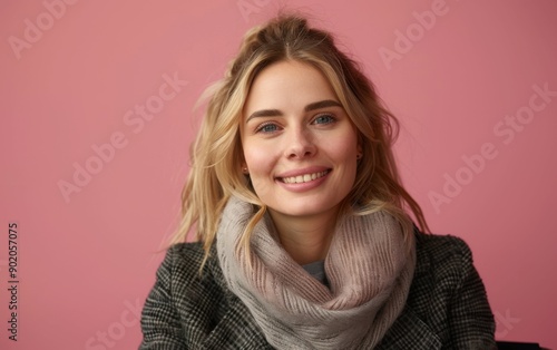 A smiling blonde businesswoman wearing a cozy scarf poses confidently against a soft pink backdrop