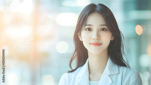 A smiling female doctor in a white coat, standing in a bright, modern medical environment, radiating professionalism and care.
