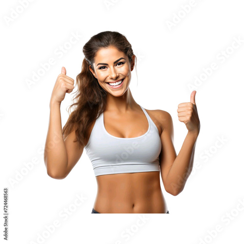 A smiling fit woman showing a thumbs up gesture in a fitness studio