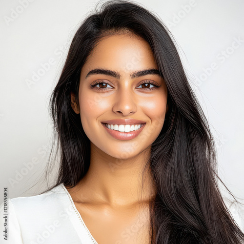 a smiling Indian woman with long, straight black hair flowing around her shoulders. She stands against a clean, white background