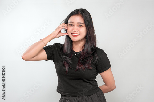 A smiling Indonesian woman with long black hair gestures a phone call sign with her hand. She wears a black t-shirt, expressing friendliness, approachability, and communication in a studio shot.