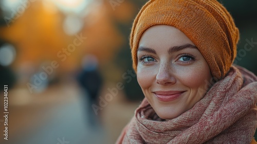 A smiling woman in a cozy scarf and hat, enjoying autumn outdoors.