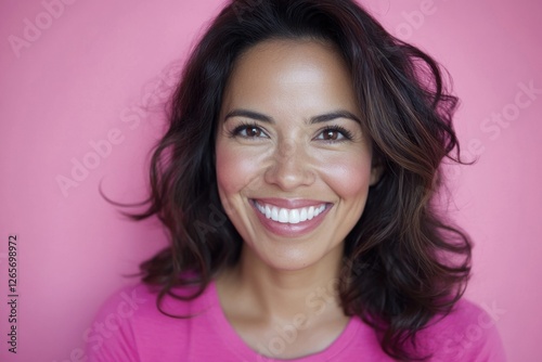 A smiling woman in a pink shirt standing against a pink background