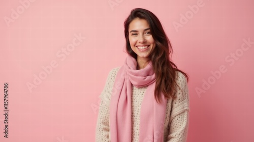 A smiling woman wearing pink scarf symbolizing strength and resilience in cancer, standing confidently against a solid background