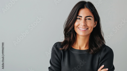 A smiling woman with brown hair playfully touches her hair while wearing a warm sweater and jacket, exuding a cheerful vibe in a soft-lit space.