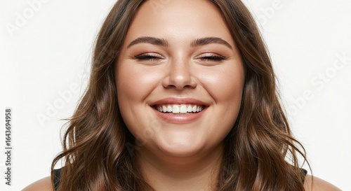A smiling woman with brown wavy hair, light skin, and closed eyes is seen against a white backdrop in a portrait.