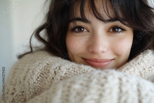 A smiling woman with layered dark hair and soft skin wraps herself in a cozy knit garment, highlighting the essence of joy, comfort, and warmth.