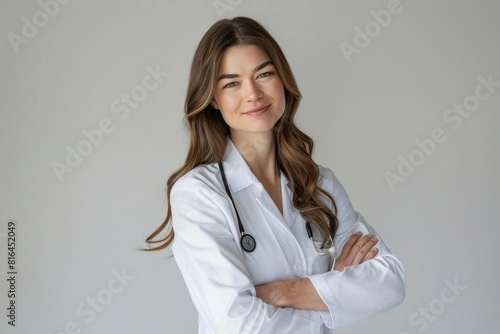 a smiling woman with long brown hair wearing a white shirt stands in front of a white wall, holding a stethoscope in her hand