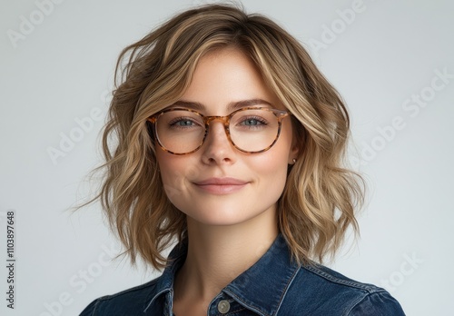 A smiling woman with wavy hair and glasses, posing against a neutral background.