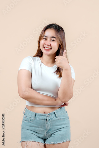 A smiling young woman giving a thumbs-up gesture, exuding positivity and confidence, set against a soft beige background, radiating happiness and approval.