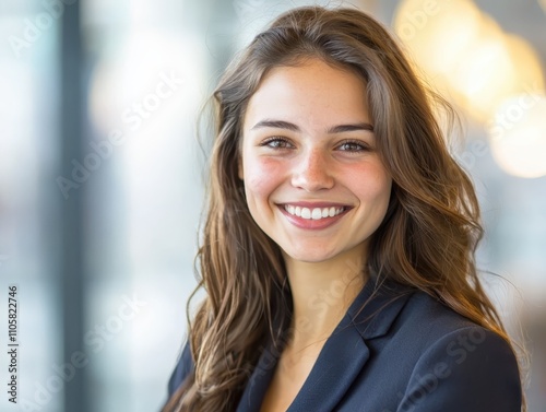 A smiling young woman in a professional outfit, exuding confidence and warmth, set against a blurred backdrop.