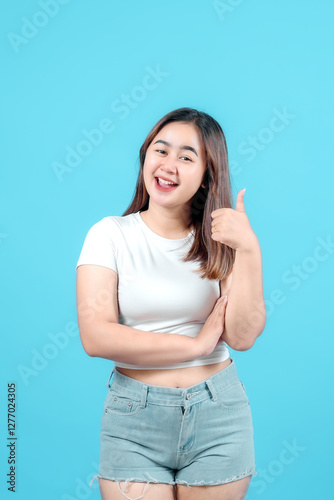 A smiling young woman in a white t-shirt gives a thumbs-up gesture, showcasing her positive attitude against a bright blue background, radiating confidence and happiness.