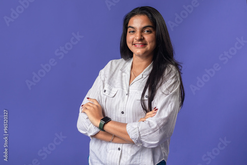 A smiling young woman of Indian descent, wearing a white striped shirt and a black smartwatch, stands confidently against a solid purple background with arms crossed, radiating positivity