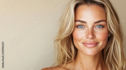 A smiling young woman with blonde hair and freckles radiates warmth and positivity, highlighted beautifully against a gentle beige backdrop, epitomizing youthful joy.