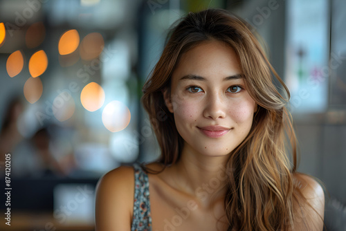 A smiling young woman with long hair sits in a modern cafe, her face illuminated by warm, ambient lighting, creating a welcoming and relaxed atmosphere.