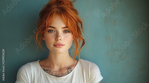 A smiling young woman with long, wavy red hair is shown in profile against a light blue background.