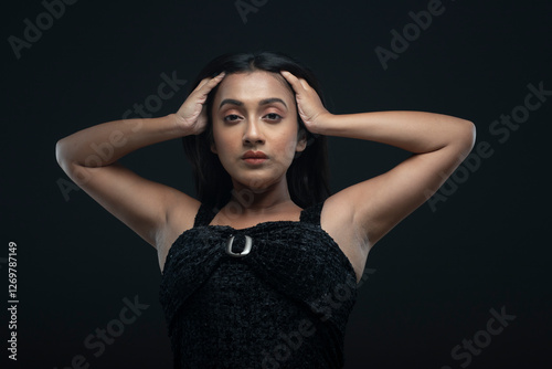 a solo female model with long black hair wearing a black skirt
