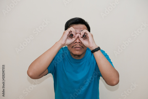 A Southeast Asian man in a turquoise green t-shirt Funny obvious peeking with hand on eyes in a white background. This image shows curiosity