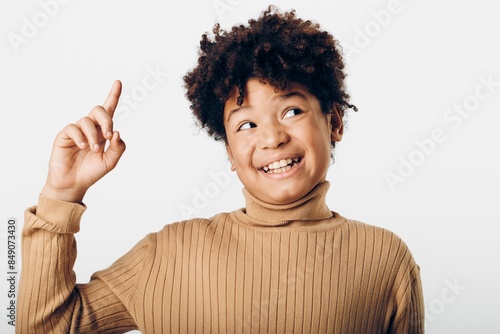 A spirited young african american girl joyfully pointing upwards, excited and full of energy against a clean white background