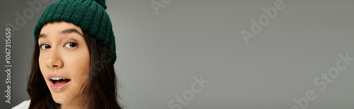 A spirited young woman showcases her trendy outfit, conveying a blend of emotions and style.
