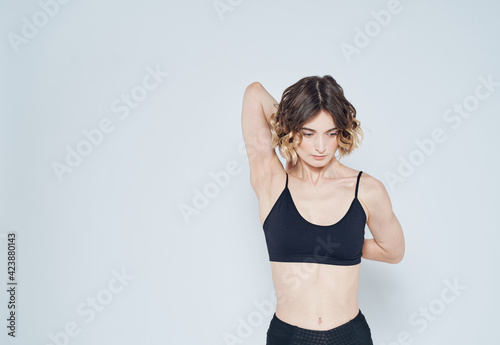 A strange woman in a short T-shirt has joined her hands behind her back on a light background