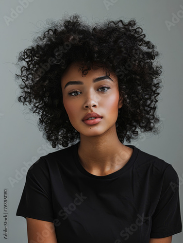A striking portrait of a beautiful woman with luscious curly hair wearing a black t-shirt against a muted backdrop
