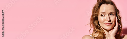 A striking woman exudes elegance while posing gracefully in front of a vibrant pink background.