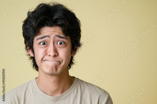 A studio close-up portrait of a young Asian man wearing a casual t-shirt, with a colourful background.