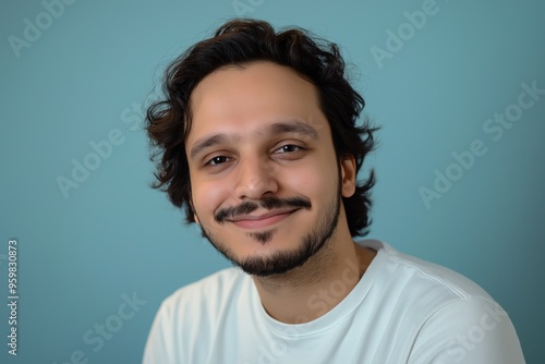 A studio close-up portrait of a young Indian or Pakistani man wearing a casual t-shirt, with a colourful background.