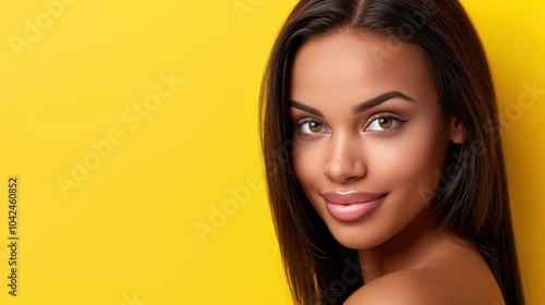 A stunning closeup of a darkskinned woman with long hair, radiant features, and vibrant colors that capture attention.