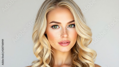 A stunning woman, glamorous fashion makeup, striking contrast of porcelain-like skin and snow-white hair, styled in loose, effortless waves, capturing a sense of elegance, sophistication.