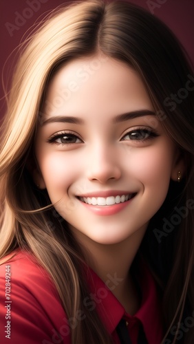 A stunning young woman with flowing hair and a vibrant red shirt.