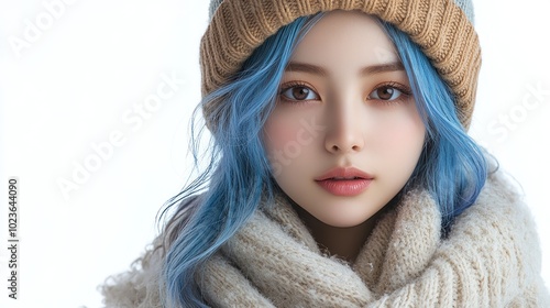 A stylish young woman showcases her vibrant blue hair while bundled up warmly