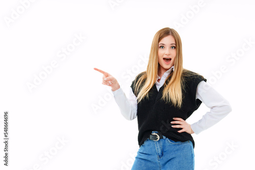 a surprised blonde in a black vest shows fingers on a white background