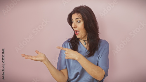 A surprised middle-aged hispanic woman points to her open hand against a pink isolated background.