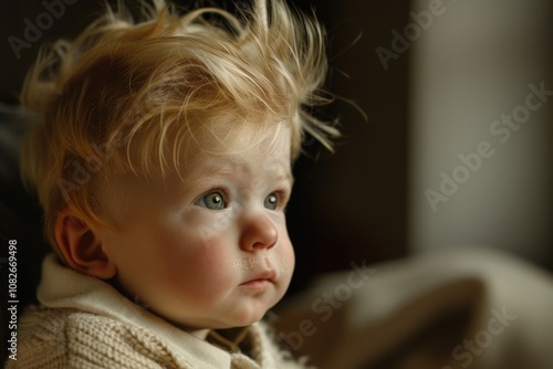 A surprised toddler with tousled blonde hair and bright blue eyes looking directly at the camera in a softly lit room during the morning