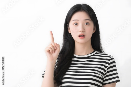 A surprised young Asian woman having a eureka moment, pointing her finger up with a great idea, isolated on a white background.