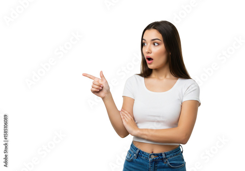 A surprised young woman points to the side with an astonished expression isolated on a transparent background