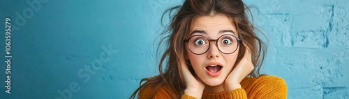 A surprised young woman with glasses expressing shock against a vibrant blue background, showcasing emotions in a playful setting.