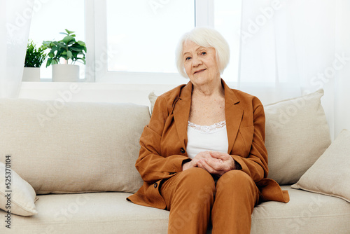 a sweet, amiable elderly woman in a brown suit is sitting on a beige wide sofa, smiling pleasantly while in the comfortable environment of her apartment