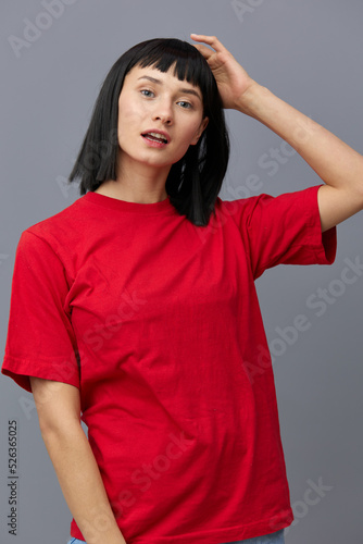 a sweet, beautiful, attractive woman stands on a gray background in a red T-shirt and touches her hair with a gentle hand gesture, smiling pleasantly