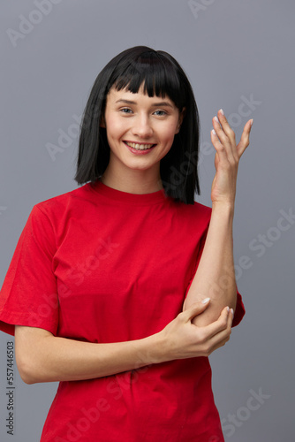 a sweet, pleasant, beautiful woman stands on a grey background in red t-shirt and looking at the camera holds her hand in a relaxed gesture.