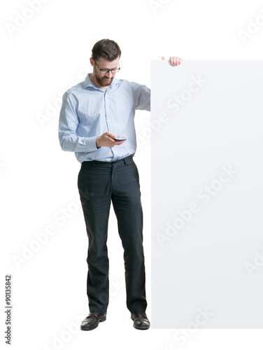 A teacher holding a placard and surfing in the smartphone.