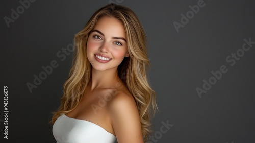 A teenage woman in a simple white gala dress poses relaxedly, smiling at the camera with her long, slightly curled hair in front of a gray studio background.