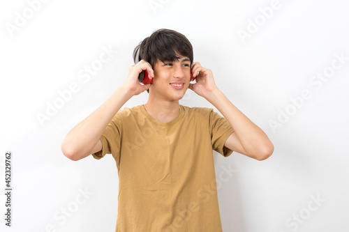A teenager boy with wireless headphones on his head listens to music on a white background.