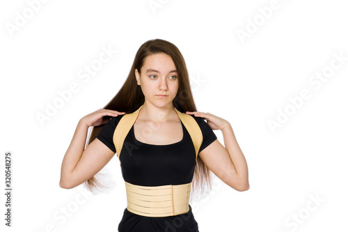 A teenager of 14 years wearing a rehabilitation corset isolated on a white background