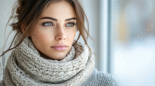 A thoughtful woman in a grey sweater gazes out the window, lost in contemplation, bathed in natural light.